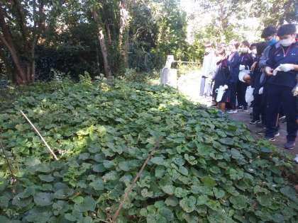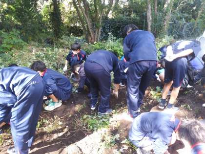 食料自給率の問題や、食べられる事のありがたさについて理解を深めようと、6月から格技室横で育てていたサツマイモの収穫を行いました。荒れ地でも育ち、それほど手間をかけなくても良い(?)と、聞いていたサツマイモですが、結果は…写真の通りとなりました(笑)。