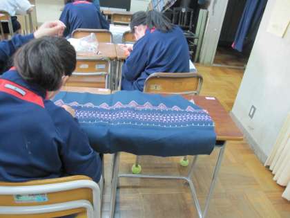 スエーデン刺繍は学年が上がると布の大きさも大きくなります。長い刺繍糸が絡まないように慎重に引っ張っています。