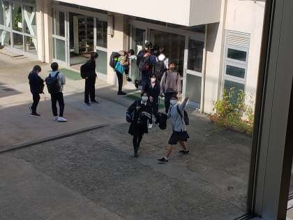 考査初日が終わりました。生徒たちが帰路に着いています。まだ2日ありますから、気を抜くことはできませんが、少しだけホッとしたようです。頑張ったのでお腹も空いたことでしょう。今日は家でゆっくりランチタイムですね。