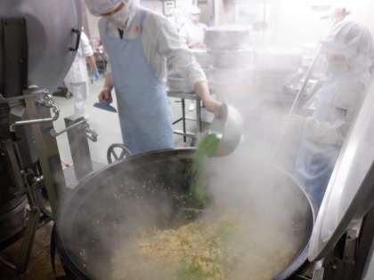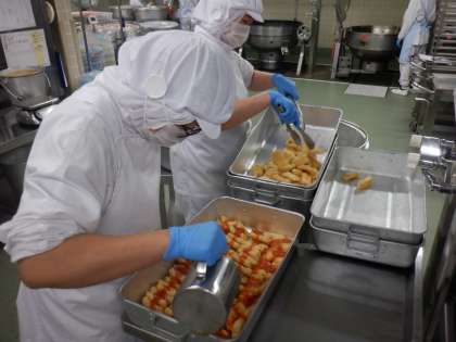 中華料理は熱した鉄鍋で作るとおいしいですよね。給食室にある回転釜は鉄製なので中華料理と相性がよいです。今日のチャーハンは約120人分ずつ6回に分けて大きな釜で炒めています。だから給食で出すときも ”なんちゃってチャーハン” にならずおいしく仕上がり、皆さんからも好評です。おかずはチリソース。えびは高くてなかなか手が出せないのでいかです。いかのチリソースは給食ならではの楽しみ方だと思います。