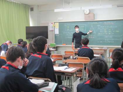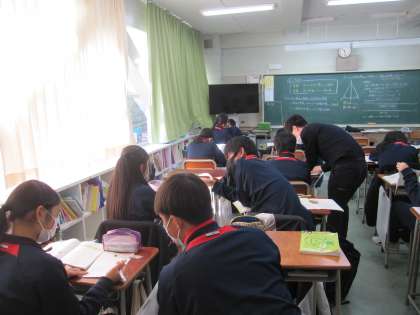 図形の証明に挑戦中です。生徒同士の学び合いが自然と行われています。教えることでより理解が深まることがありますね。