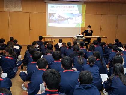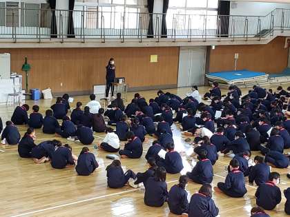 1年生は格技室で「ビブリオバトル」が行われています。各クラスの代表者による本の紹介。果たしてどの本を読みたくなったでしょうか?