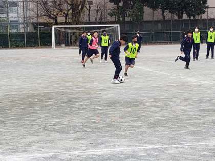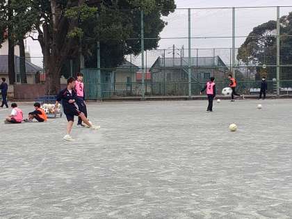 3年生体育、サッカーは全面を使っての本格的なゲームです。校庭の隅から隅までボールを追いかけています。サッカー経験者にとっては当たり前のスケールですが、未経験者にとっては相当な運動量となります。ミニゲームで感覚を掴んだ生徒たち。全面でのゲームにも全力で取り組んでいました。