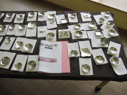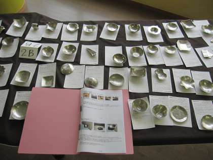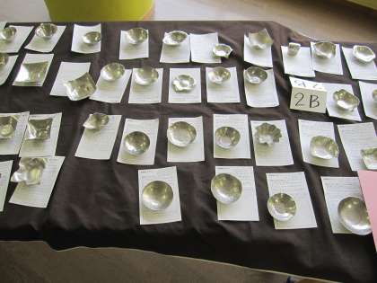 錫を叩いて叩いて、磨いて磨いて出来上がった作品です。生徒の皆さん、自分の作品見つかりますか。