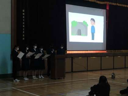 本日の総合では、体育館で平和学習の、代表の班による発表会がありました。それぞれのテーマで、今週、放課後の時間を使って練習をしてきました。話し方や立ち位置、資料の見え方など何度も確認し本番直前まで工夫をしてきました。本番は、しっかりと聞く人に伝わる発表ができていましたね。また、臨機応変に対応する、裏方の学級委員の動きも立派でした。