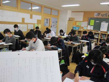 小論文の作成にもつながる学習です。生徒たちは文章の構成に気をつけながら真剣に取り組んでいます。
