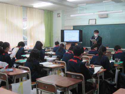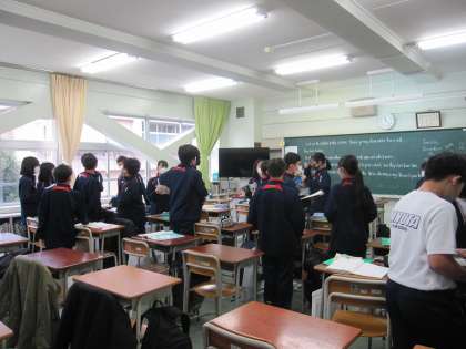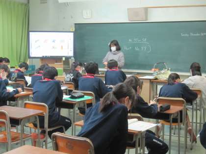 あるクラスでは「明日の遠足の持ち物を欠席者に電話で知らせよう」というテーマのリスニングを行っていました。持ち物を聞き取るだけでなく、おやつは300円以内でとか、明日の集合時刻は7時45分ということも聞き取っていました。1年生にはレベルの高い内容かと思いましたが、良く聞き取っていて感心しました。