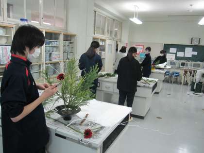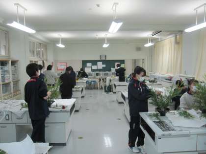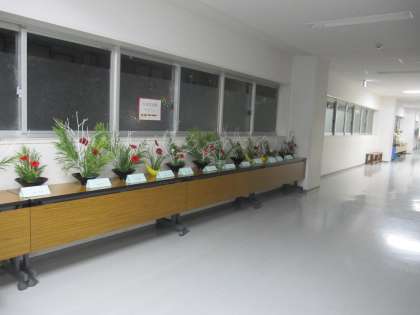 日本文化部が華道の活動を行いました。今回はクリスマスの花です。杉の枝が固く、入部したての生徒は苦労していましたが、先輩のアドバイスを聞きながら頑張りました。みんな個性あふれる作品になりました。