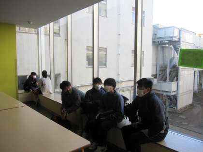 早めに登校した生徒が多目的ホールでくつろいでいます。