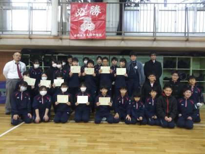 今年度は1年生女子、男子の部でそれぞれ三位入賞、2年生女子の部で準優勝と三位獲得。そして2年生男子の部は、なんと決勝が砧中剣道部の同門対決でした(写真二枚目。優勝、準優勝獲得!!)。その他敢闘賞にも多数入賞し、日頃の成果が十分に発揮できた大会でした。