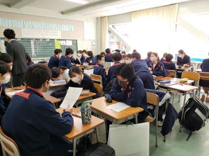 2年生、校外学習の準備が進んでいます。今朝は各教室に分かれての係会があり、そこで話し合われた内容を班会議で伝達しました。