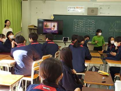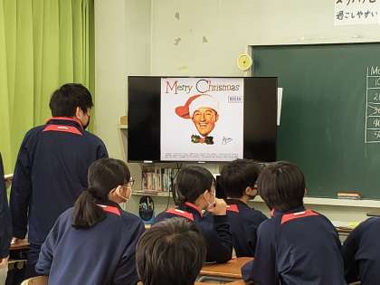 今日はALTを中心に、班対抗のクリスマスクイズが行われました。ジャンルを選び、そこからクリスマスに関連するクイズが出題されます。もちろんオールイングリッシュです。例えば映画ジャンルを選択すると、有名なクリスマス映画の映像からそのタイトルを当てます。今回の映画は『ポーラー・エクスプレス』でした。エクスプレスは急行列車ですが、ポーラーって何でしょうね?