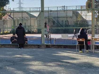 朝からテニスコートでは、女子テニス部の世田谷区研修大会・順位決定戦が繰り広げられています。日が当たる場所はまだしも、日陰に入るとじっとしているのも辛い寒さです。