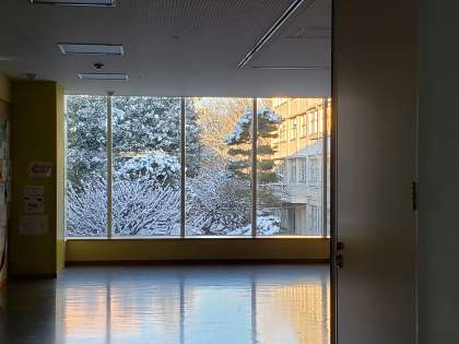 多目的ホールはまさに雪の屏風絵です。京都のお寺などで見られる「借景」ですね。