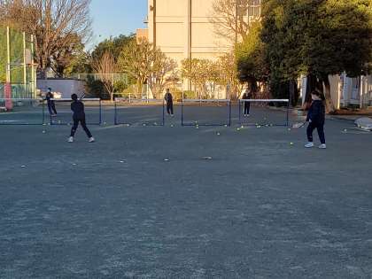 朝練習の女子テニス部。テニスコートに水がたまっていたため、グラウンドでの練習に切り替えました。コーチからは「試合会場によっては土の上でプレーすることもあるので慣れておくように」との指示がありました。改めて砧中のテニスコートは恵まれた環境にあることを認識しました。