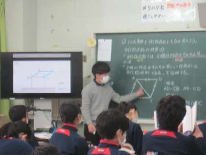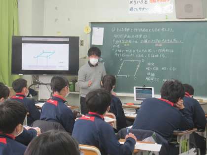 2年生数学の図形の証明「平行四辺形になるための条件」を学んでいます。