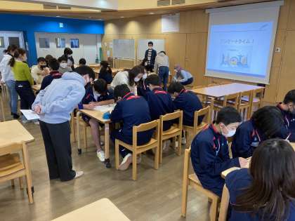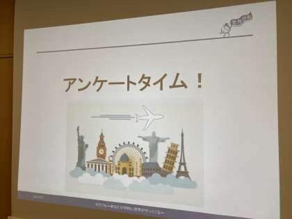 全ての大陸のゲームを終え、ランチルームでアンケートを記入しています。学習したことを振り返る大事な時間を過ごしています。