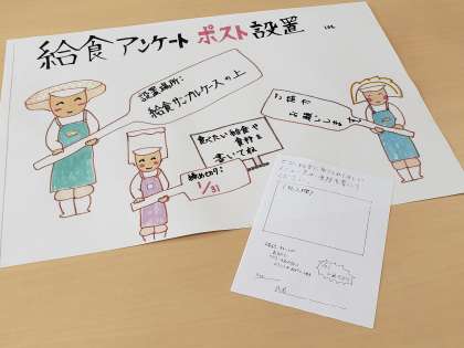 パーティションで区切られ、黙食が続いている学校給食。給食の時間を少しでも楽しんでもらえないかと、給食委員の生徒たちの提案で、生徒たちの希望をアンケートで聞くことにしました。例えば「人気メニューの回数を増やしてほしい」「デザートには○○を」など。もちろんすぐに実現できないものもあると思いますが、長引くコロナ下での給食に、少し楽しみが増すといいですね。2年生を中心とした生徒たちの提案、砧中生の企画力はさすがですね。