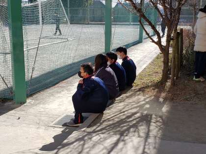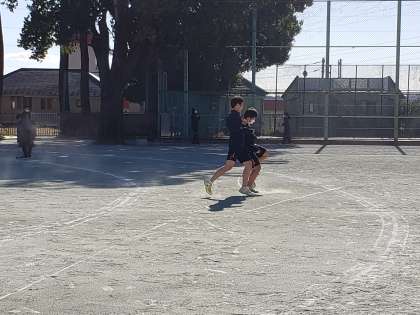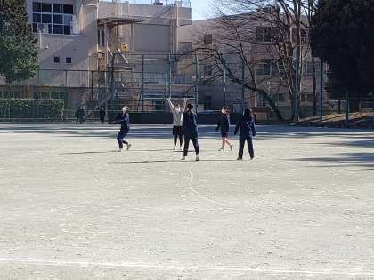 オンライン授業参加者もいるため、普段よりは校庭で遊ぶ生徒が少ない昼休み。暖かな陽射しに包まれています。部活動の時間短縮や休日の外出もままならない中、改めて外遊びの大切さを感じます。校庭が広々と使える分、思いっきり駆け回ってくださいね。