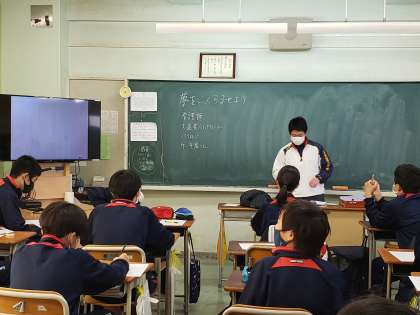 1年生はキャリア教育の一環として「将来の夢をふくらまそう」という話し合いです。今、自分が思い描いている夢を語ってもらいました。描いた通りになる将来もあれば、全く予想していなかった進路をたどることもあります。様々な偶然が重なって進路が開けることもあります。それでも中学1年生の時の「初心」は忘れないでくださいね。