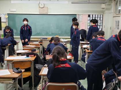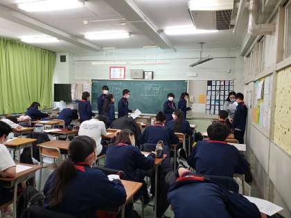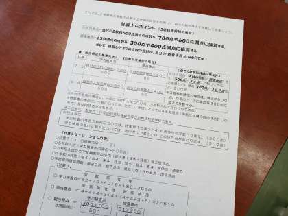 2年生キャリア学習、都立高校入試の得点を実際に試算しています。入試では何点とれるかまだわかりませんので、2学期の期末考査の得点と2学期の評定を使っての仮計算です。計算方法がわからない場合は、先生も一緒に計算してくれています。