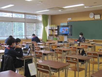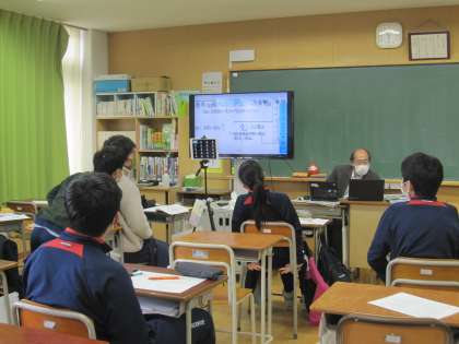 下の写真のクラスは、配信用タブレットがあるので授業者のいるクラスです。黒板は使用せずロイロノートでプリントを画面共有しながら授業しているので、自宅から受けている生徒にも見やすいと好評です。