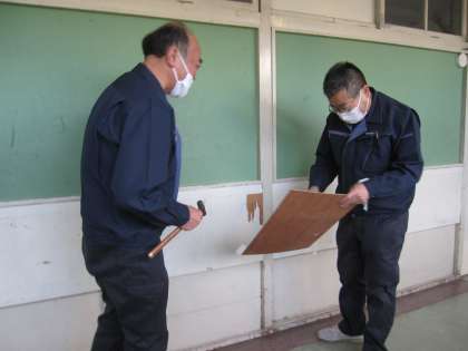 早朝から主事が廊下の壁の修繕を行っています。古い校舎なのでささくれで皆さんがけがをしないように、いつもより良い環境で生活できるようメンテナンスを心がけています。