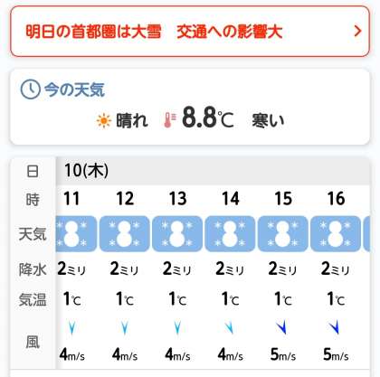 明日10日から11日にかけて関東地方に降積雪の予報が出されています。