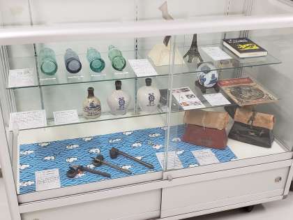 多目的ホール横の展示コーナー。前回から人気アニメの『鬼滅の刃』をモチーフにした企画展示を行っています。なかなか馴染みの少ない大正時代を様々な展示品を参考に学んでもらおうという企画です。