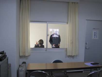 写真は、朝礼前の余裕の姿と放送中の急な対応にあたる様子です。