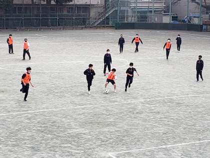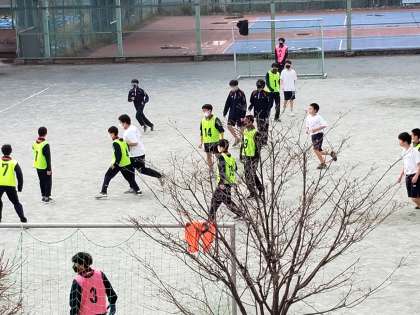 1年生体育、校庭でサッカーのゲームに集中しています。寒さも少し緩んできたようで、生徒の動きにもキレを感じます。