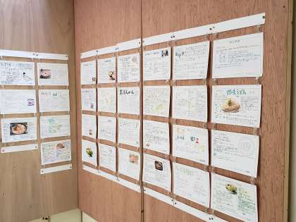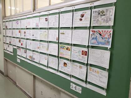 2年生が家庭科の課題学習として、郷土料理調べを行いました。調理室前の廊下に作品を掲示中です。「ほうとう」や「きりたんぽ」、「ずんだ餅」に「ゴーやチャンプル」等々見ているだけで食してみたい誘惑にかられます。もちろん校長の故郷の郷土料理である「讃岐うどん」も多くの生徒が調べていました。