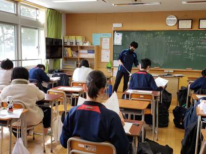 数学では問題を解いていました。これまで学んできた数学の知識を総動員して発展問題に取り組んでいました。問題解決的な内容のようです。入社試験などではこういった問題解決型の試験問題が多いようです。確かに社会へ出ると、知識を暗記するのではなく、その知識を活用しながら様々な問題を解決していく力が求められます。