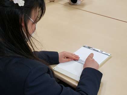 白杖の使い方や点字の打ち方などの説明もあり、校長と在学時の学級担任でお話をお伺いして、4月以降新たな取り組みとして砧中としても積極的に検討していくことになりました。