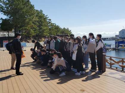 海をバックに、はい、ポーズ。