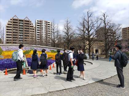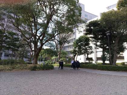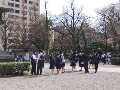 クラスのメンバーが集合したらお話を聞きます。良い天気で外は、暑いくらいです。(副校長)