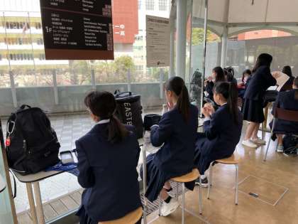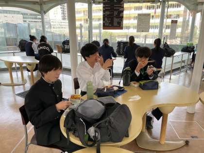 江戸東京博物館に到着した班が、見学と昼食を取っています。昼食は広場の中で密にならないように気をつけながら、食べています。この後も各班で見学地を回ります。いってらっしゃい!