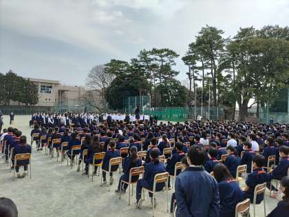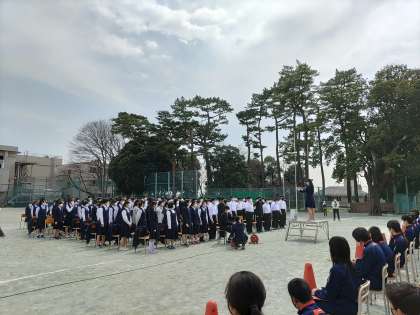 コロナ下で避難訓練以外で全校生徒が一同に会したのは今年度は今日が初めてです。卒業式も在校生は、代表しか出席できない状況から、砧中の合唱の伝統を後輩に伝えたいと昨年度の卒業生の提案で始まったこの企画。3年生が1,2年生に合唱を聴かせてくれました。