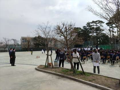 反響する壁の無い校庭での合唱でしたが、素敵なメッセージが1,2年生に届いたと思います。(副校長)