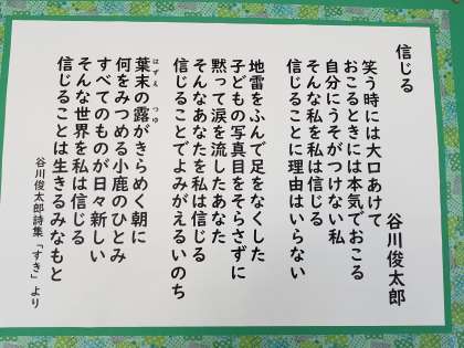 図書コーナーで紹介されている谷川俊太郎さんの「信じる」という詩です。今年度の授業日も残すところ一週間。「誹謗」や「中傷」が溢れる社会の中で、お互いを「信じる」ところから関係を構築していく、そんな学校でありたいと切に願っています。