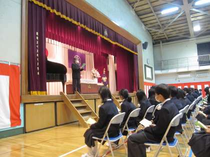 皆さんと同じく、今年から砧中にまいりました音楽科の中です。校歌を皆さんに紹介するために短い時間で集中して練習しました。入学式での紹介で、メロディーを少しでも覚えてもらえたならば嬉しいです。3年間、様々な場面で歌うことになる砧中学校の校歌。音楽の授業で取り組みます。先輩方と一緒に行事で歌えるように頑張っていきましょう。