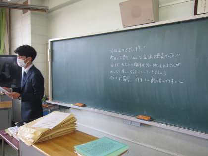 1年生の教室の黒板には担任からのメッセージをご覧ください。