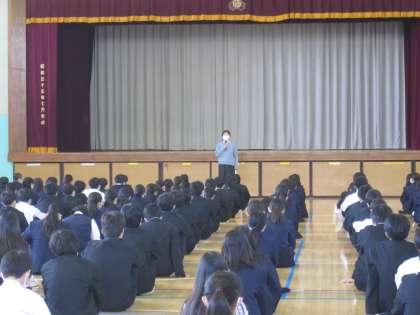 ぴしっと整列し、先生の話を聞く態度に3年生の自覚が伝わってきます.