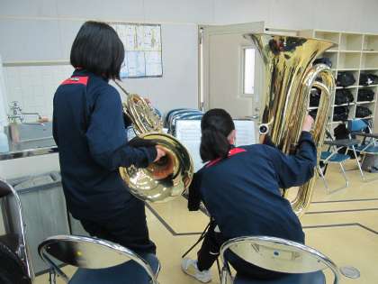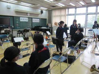 吹奏楽部では1年生が希望する楽器の体験をして、上級生がマンツーマンで指導しています。