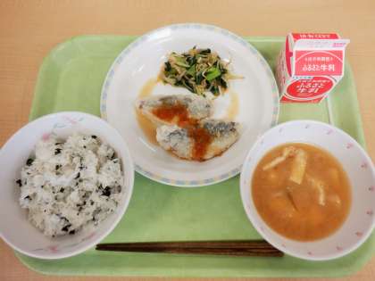 今日のメインは、春に旬を迎えるアジです。30gの小ぶりの物を2個付けで出しています。片栗粉をまぶして油で揚げて、しょうゆ・砂糖・玉ねぎなどから作った甘辛ダレをかけています。アジといえば、骨が多く、学校給食でもよく骨が刺さったという事例を聞きやすい魚ですが、今回は油でしっかり揚げているので、しっかりよく噛めば骨ごと食べることができます。これからもししゃもなどの骨ごと食べられる魚は、成長期の中学生にとって貴重なカルシウム源となるので、しっかりよく噛んで骨ごと食べてほしいです。