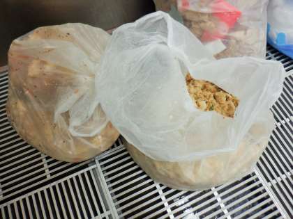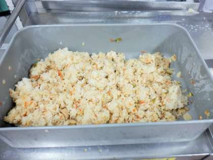 砧中学校でも、比較的多くの残菜が残りました。多いところでは、2枚目の写真のように1クラスでこのくらい残っていました。この日の残菜は、混ぜご飯だけで大きいゴミ袋が2つ分程度になりました(3枚目の写真)。