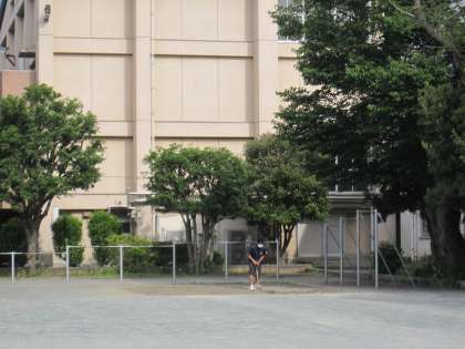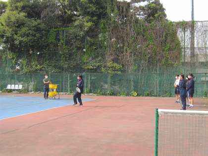 朝練習のテニス部、走り幅跳びの準備をする体育科教員の姿があります。