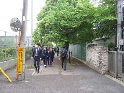 担当教員とボランティアの皆さんが学び舎あいさつ運動から戻ってきました。