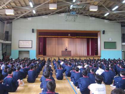 2,3年生は体育館で、1年生は教室からZoom配信で行う計画でしたが、Zoom配信の準備が整わないまま始めてしまいました。