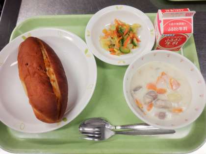 チリビーンズドッグは、パンに縦の切り込みを入れて、そこに具をはさみます。具は豚ひき肉、にんにっく、みじん切りの大豆・玉ねぎ・人参、そしてトマトピューレとケチャップなどの調味料で作っています。最後に、チーズをのせてオーブンで焼いて出来上がりです。ピザに近い味で美味しかったです。大豆の栄養もとれるので、しっかり食べてほしいです。